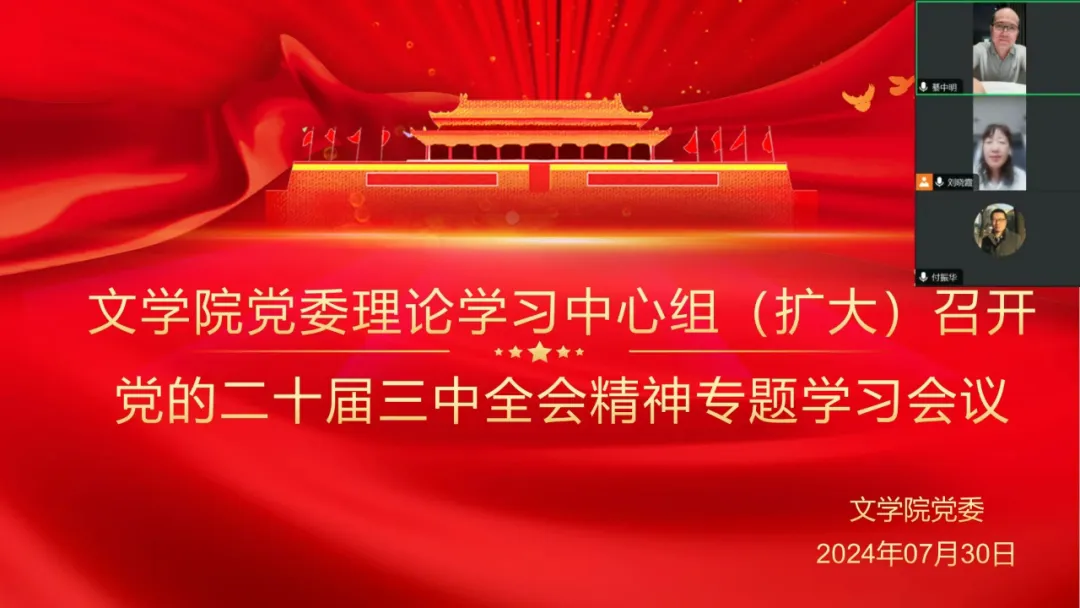 为深入学习贯彻党的二十届三中全会精神,深刻领悟和把握进一步全面深化改革的主题、重大原则、重大举措、根本保证,切实把思想和行动统一到党中央决策部署上来,文学院党委理论学习中心组(扩大)于7月30日18:30召开第八次集体学习会议暨党的二十届三中全会精神专题学习。文学院班子成员、科级干部、党支部书记、辅导员、教学秘书参加了本次会议。会议由文学院党委书记刘晓霞主持。