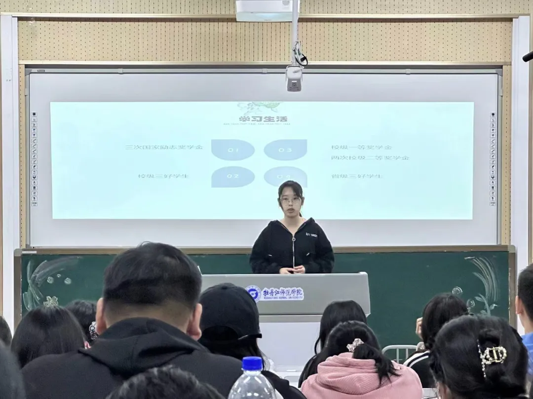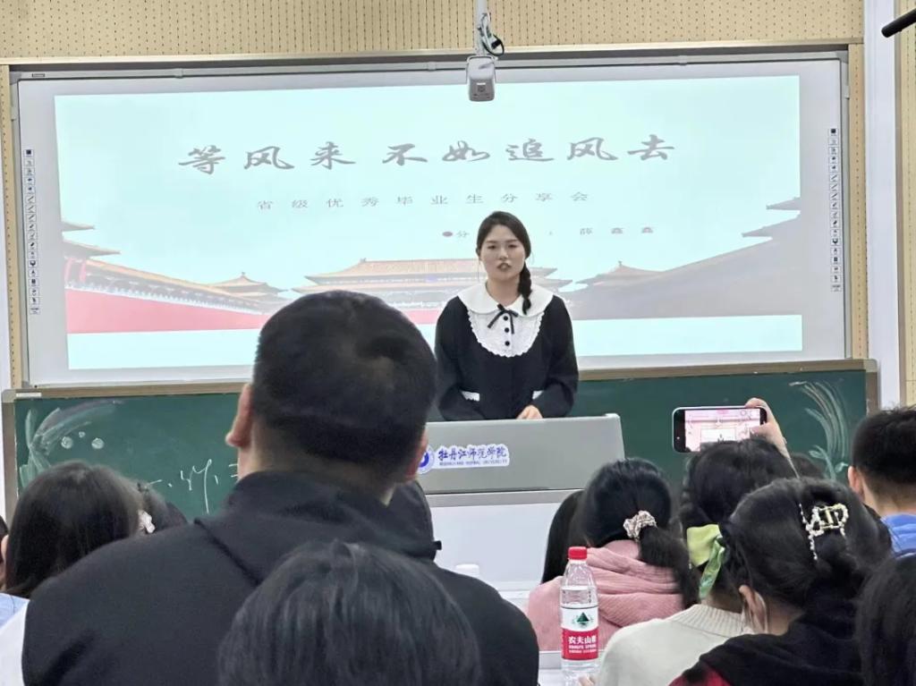 薛鑫鑫同学经验分享的主题是“等风来,不如追风去”。在学习方面应当做到“勤学善思,学无止境”,在工作方面则要做到“尽职履责,砥砺前行”。她还强调,大学时间不可浪费,应该做好规划,大三前考取英语四六级证书,大三决定考研考公还是就业。她还建议同学们平时要多出去走一走,拓宽眼界;去参加比赛,促进个人发展;去不断尝试新鲜事物,不要害怕失败,同时也不要为过去而懊悔、为未来而迷茫,要用行动打败焦虑。