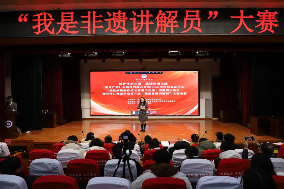 为贯彻落实党的二十届三中全会和黑龙江省哲学社会科学工作推进会精神,加强高校社科普及能力建设,增强大学生社科普及的责任意识与非遗保护传承能力,12月10日,黑龙江省社科科学界联合会立项支持的2024年度社科普及活动——“保护传承非遗,赓续历史文脉”:非遗公开课、非遗展览展示活动暨牡丹江师范学院第一届“我是非遗讲解员”大赛决赛在我校春秋讲坛举办,该活动由我校科研处、文学院支持,黑龙江省非物质文化遗产研究学术交流基地主办,文学院党委书记刘晓霞出席本次大赛。省非物质文化遗产研究学术交流基地主任宋娟教授、文学院副院长施新佳、文学院副院长付振华、历史与文化学院教师尹立娜、美术与设计学院教师赵立石担任本次决赛的评审工作。