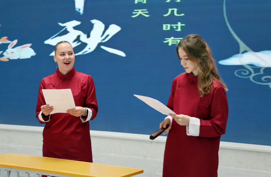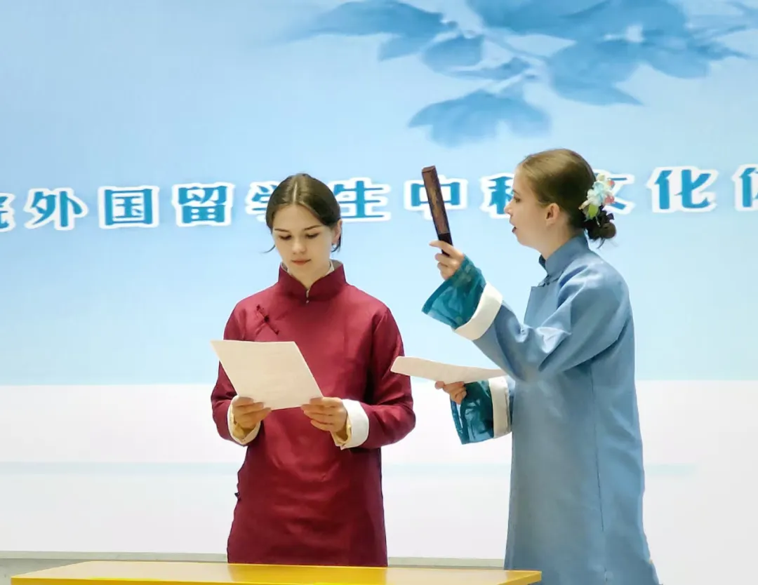 在专业老师的指导下,留学生集体演唱了《水调歌头·明月几时有》,优美深情的歌声蕴含着留学生们对中国传统文化的理解和美好的节日祝福,将活动推向高潮。